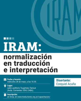 También en mayo, acompañamos una actividad organizada por el CTPCBA, en la que Francisco Ezequiel Acuña, especialista del IRAM, ofreció una charla sobre normalización en traducción e interpretación. La moderación estuvo a cargo de nuestro socio Martín Barrère.
